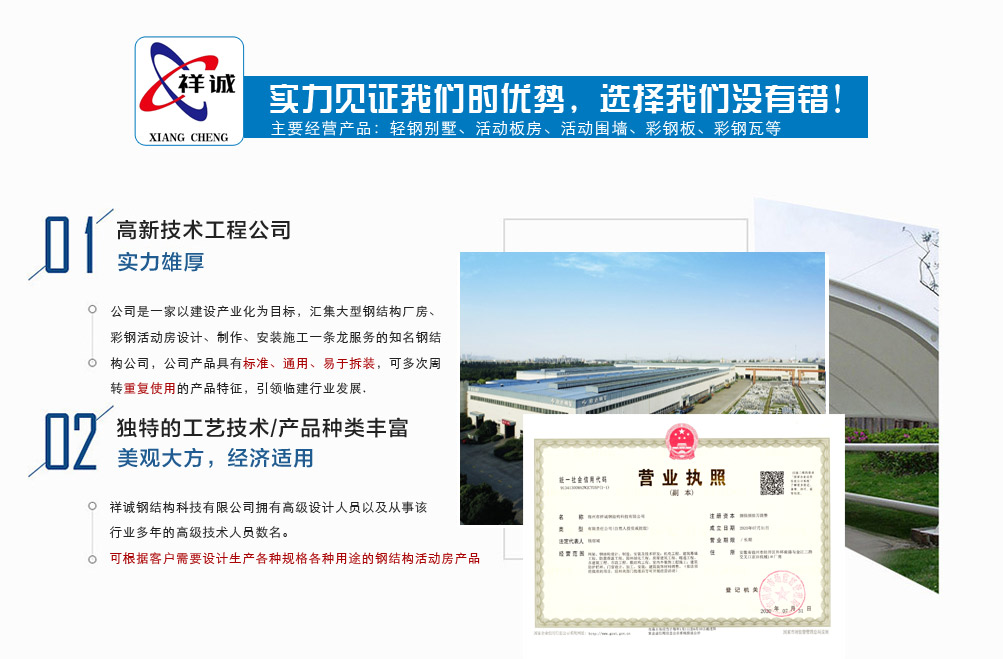 宿州市祥誠鋼結(jié)構(gòu)科技有限公司位于宿州市經(jīng)開區(qū)外環(huán)南路與金江二路交叉口北,公司是一家以建設(shè)產(chǎn)業(yè)化為目標(biāo),匯集大型鋼結(jié)構(gòu)廠房、彩鋼活動房設(shè)計、制作、安裝施工一條龍服務(wù)的知名鋼結(jié)構(gòu)公司。公司現(xiàn)有固定資產(chǎn)1000余萬元、流動資金近千萬元公司。現(xiàn)有員工40人,大專以上學(xué)歷30人,其中高級工程師1人、工程師2人、會計師1名。各工種持證上崗率100%。高效化的年青團(tuán)隊為公司帶來了蓬勃發(fā)展的動力,全體員工以務(wù)實的態(tài)度,拼搏的精神,創(chuàng)造著企業(yè)的每一天。 公司組織結(jié)構(gòu)嚴(yán)格按現(xiàn)代企業(yè)制度設(shè)計,管理機(jī)構(gòu)設(shè)置合理,制度完善,各部門分工明確...